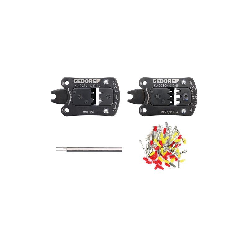 Stückliste (Text): 1x KL-0080-1012-14 - Crimpzangenaufsatz, MCP 1.5K 1x KL-0080-1012-15 - Crimpzangenaufsatz, MCP 1.5K ELA 1x KL-0080-1032-9 - Ausdrückklinge, MCP 1.5K 1x KL-0080-1312 VE - Buchsenkontakt, MCP 1.5K, 0,2 - 0,35 mm² (25 Stk) 1x KL-0080-1313 VE - Buchsenkontakt, MCP 1.5K, 0,5 - 1,0 mm² (25 Stk) 1x KL-0080-1314 VE - Buchsenkontakt, MCP 1.5K ELA, 0,2 - 0,35 mm² (25 Stk) 1x KL-0080-1315 VE - Buchsenkontakt, MCP 1.5K ELA, 0,5 - 1,0 mm² (25 Stk) 1x KL-0080-1316 VE - Buchsenkontakt, MCP 1.5K ELA, 1,0 - 1,5 mm² (25 Stk) 1x KL-0080-1309 VE - Dichtung, MCP 1.5K ELA, 0,35 - 0,5 mm² (25 Stk) 1x KL-0080-1310 VE - Dichtung, MicroTimer ELA, 0,5 - 0,75 mm² (25 Stk) 1x KL-0080-1311 VE - Dichtung, MicroTimer ELA, 1,0 - 1,5 mm² (25 Stk)