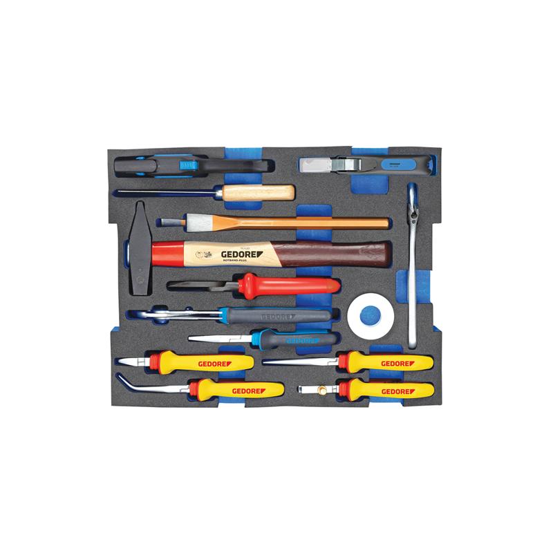 Stückliste (Text): Maurermeißel No. 110-256, 250x16 mm Elektrikermeißel No. 112-2510, 4kt 250x10x7 mm Schlosserhammer No. 600 H-500, 500 g Einmaulschlüssel verstellbar No. 60 CP 8, 8" Universalzange No. 142 10 JC, 10" Abisolierzange No. 8097, Automatik Mehrfachzange No.8133-180 JC, 180 mm 2K-Griff VDE-Seitenschneider No. VDE 8314-160 H, 160 mm VDE-Flachrundzange No. VDE 8132-200 H, 200 mm VDE-Flachrundzange No. VDE 8132 AB-200 H, gewinkelt 200 mm VDE-Abisolierzange No. VDE 8098-160 H, 160 mm VDE-Kabelschere No. VDE 8094, 200 mm Universal-Kabelmesser No. 4528, Klingen-L. 50 mm Elektroisolierband No. 4629, Band-L.10 m Spachtel No. 0175-06, Blatt-B. 60 mm Winkelschraubendreher No. H 42-10, 6kt SW 1,3 1,5 2 2,5 3 4 5 6 8 10 mm VDE-Schraubendreher-Satz No. VDE 2170-2160 PH-077, Schlitz 2,5 4 5,5 6,5 mm, Kreuzschlitz PH 0 1 2 Spannungsprüfer Schlitz No. 4615 3, 220-250 V, 3mm Spannungsprüfer Schlitz No. VDE 4616,12-1000 V, 3 mm Schaltschrank-Schlüssel ELEKTRO No. 45 E Holzgliedermaßstab No. 4533-2, 2 m + GEDORE L-BOXX® 136 No. 1100 L