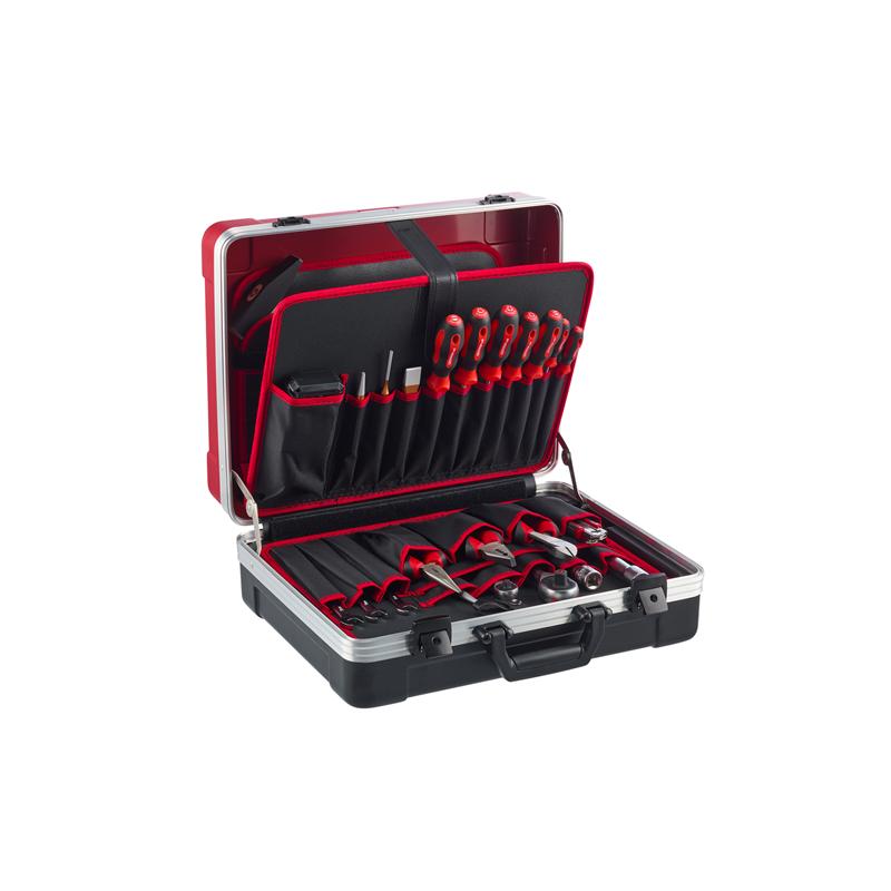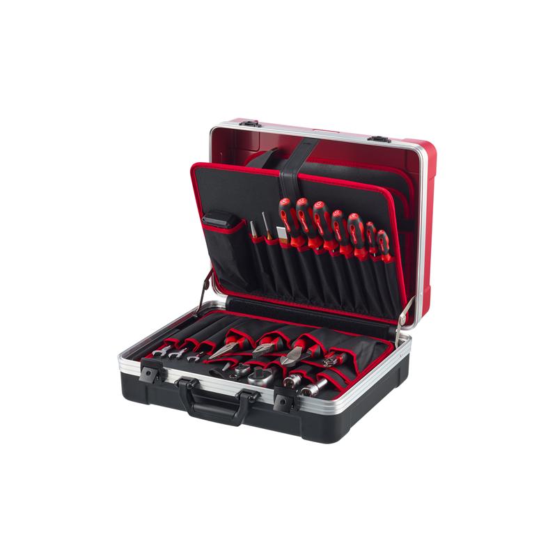Stückliste (Text): 2K-Umschaltknarre 1/2" 250 mm Verlängerung 1/2" 125 250 mm Kardangelenk 1/2" 66 mm Steckschlüsseleinsatz 1/2" 6-kant 8 10 11 12 13 14 15 16 17 18 19 22 24 27 30 32 mm 2K-Umschaltknarre 1/4" 150 mm Verlängerung 1/4" 100 mm Steckschlüsseleinsatz 1/4" 6-kant 4 4,5 5 5,5 6 7 8 9 10 11 12 13 14 mm Bit-Box, 32-tlg. Bit-Schraubendreher 210 mm Kardangelenk 1/4" 33 mm 2 x Steckleiste 8" Einsatz-Halter 1/4" + 1/2" für Steckleiste Ringratschenmaulschlüssel 8 9 10 11 12 13 14 15 17 19 mm Schraubendreher Schlitz 3 4 5,5 6,5 mm Schraubendreher Kreuzschlitz PH 1 2 Winkelschraubendreher 1,5 2 2,5 3 4 5 6 8 10 mm Kombinationszange 180 mm Kraftseitenschneider 200 mm Flachrundzange, gerade 200 mm Wasserpumpenzange 10" 250 mm Schlosserhammer 500 g Flachmeißel 150 mm Körner 4 mm | 120 mm Splinttreiber 4 mm | 120 mm Durchtreiber 4 mm | 150 mm Cuttermesser mit Bleistiftanspitzer 175 mm Bandmaß 5 m