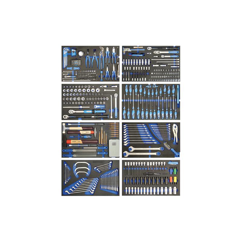Inhaltsangabe (Stückliste): Schublade 1 • 1/4“-Sortiment (12-kant SW 4-13; 6-kant lang SW 4-13; TX T10-T40; TX E4-E10; TX PLUS IP10-IP30; TX PLUS EP6-EP12; IN 3-8; Kreuzschlitz PH1-PH3; Schlitz 5,5-6,5 mm) • Bit-Box (32-tlg) • Umfangreiches Zangen-Sortiment • Winkelschraubendreher-Satz (TX T9-40; IN 2-10) • Gripschlüssel Bremsleitung (11 mm) • Stahlbandmaß (5 m) • Magnetheber Schublade 2 • 3/8“-Sortiment (6-kant SW 6-19; 12-kant lang SW 10-19; TX T20-T50; TX E6-E14; IN 4-11; XZN M5-M10; TX PLUS IP40-IP60; TX PLUS EP10-EP20; Zündkerzen-Steckschlüssel SW 14 + 16 + 18) • Spannungsprüfer (6-48 Volt AC/DC) • Drehmomentschlüssel (3/8“, 10-50 Nm) • Digital-Messschieber • Fühlerlehren Schublade 3 • 1/2“-Sortiment (6-kant SW 8-32; TX T27-T60; TX E10-E24; IN 5-17; XZN M5-M16; TX PLUS EP22-EP32) • Drehmomentschlüssel (1/4“, 40-200 Nm) Schublade 4 • Schraubendreher-Sortiment (6-kant SW 6-10; IN3-8; Kreuzschlitz PH1-PH4; Schlitz 4,5-8 mm; TX T10-T40) • Univ. Bremssattel-Haken-Paar Schublade 5 • Umfangreiches Schlag-, Hebel- und Zerspanungswerkzeug (Feilen, Hämmer, Bohrer, Hebeleisen, Meißel, Treiber, Körner) Schublade 6 • Spezial-Gripzange • Bremssattel-Bürste • Ring-Maulschlüssel (SW 6-32) Schublade 7 • Maulschlüssel mit Ringratsche (SW 8-19) • Doppelringschlüssel (SW 6-24, TX E6-E24) • Starter-Blockschlüssel (SW 11-17) • Doppelringschlüssel offen (SW 8-19) Schublade 8 • 1/2" Steckschlüsseleinsätze (6-kant lang SW 10-32; IN 6-14; TX T27-T60) • Kraftschraubereinsatz mit Schutzhülse (SW 17-22) • Kraftschraubereinsatz (SW 13-27) • Kabelmesser und Universal-Kombischere