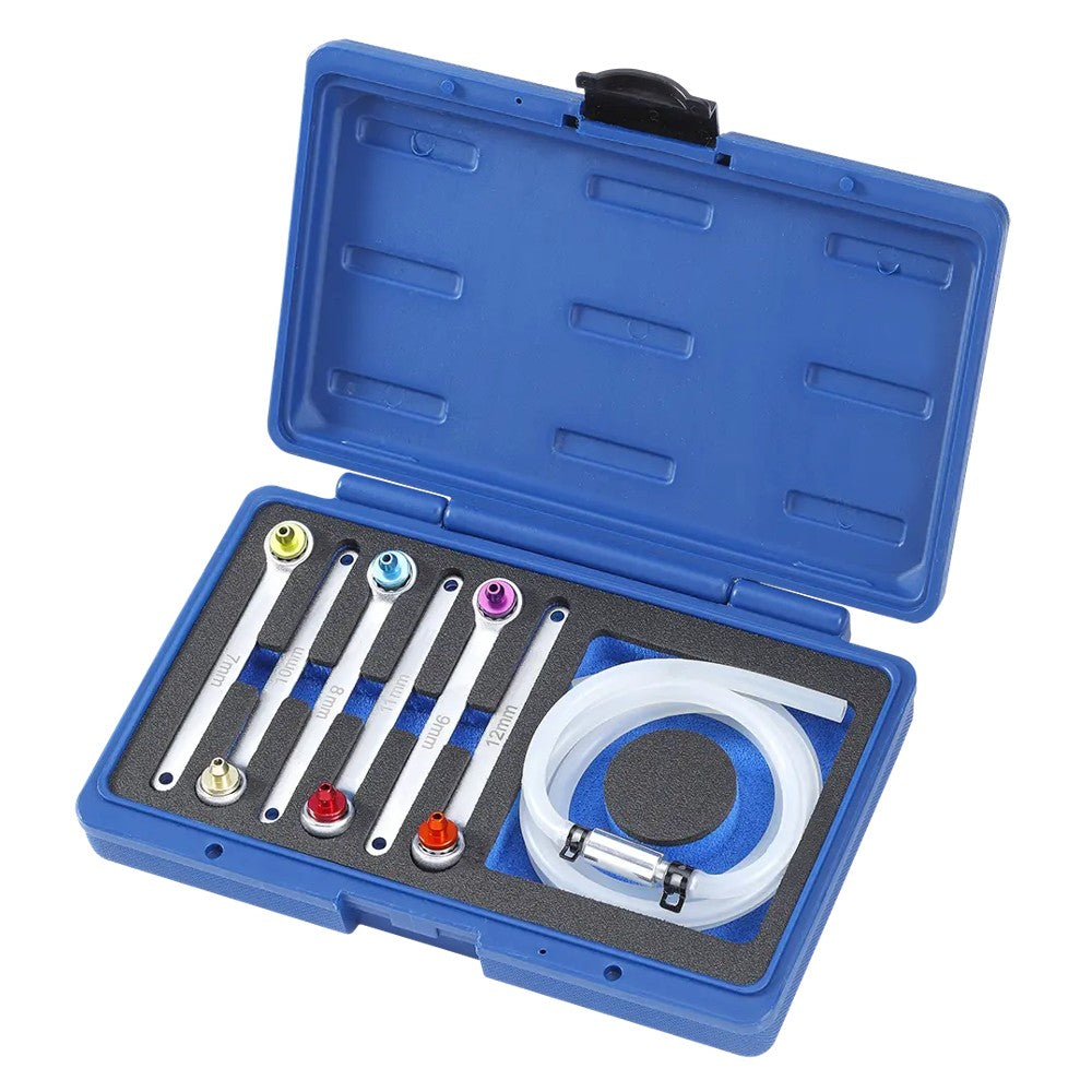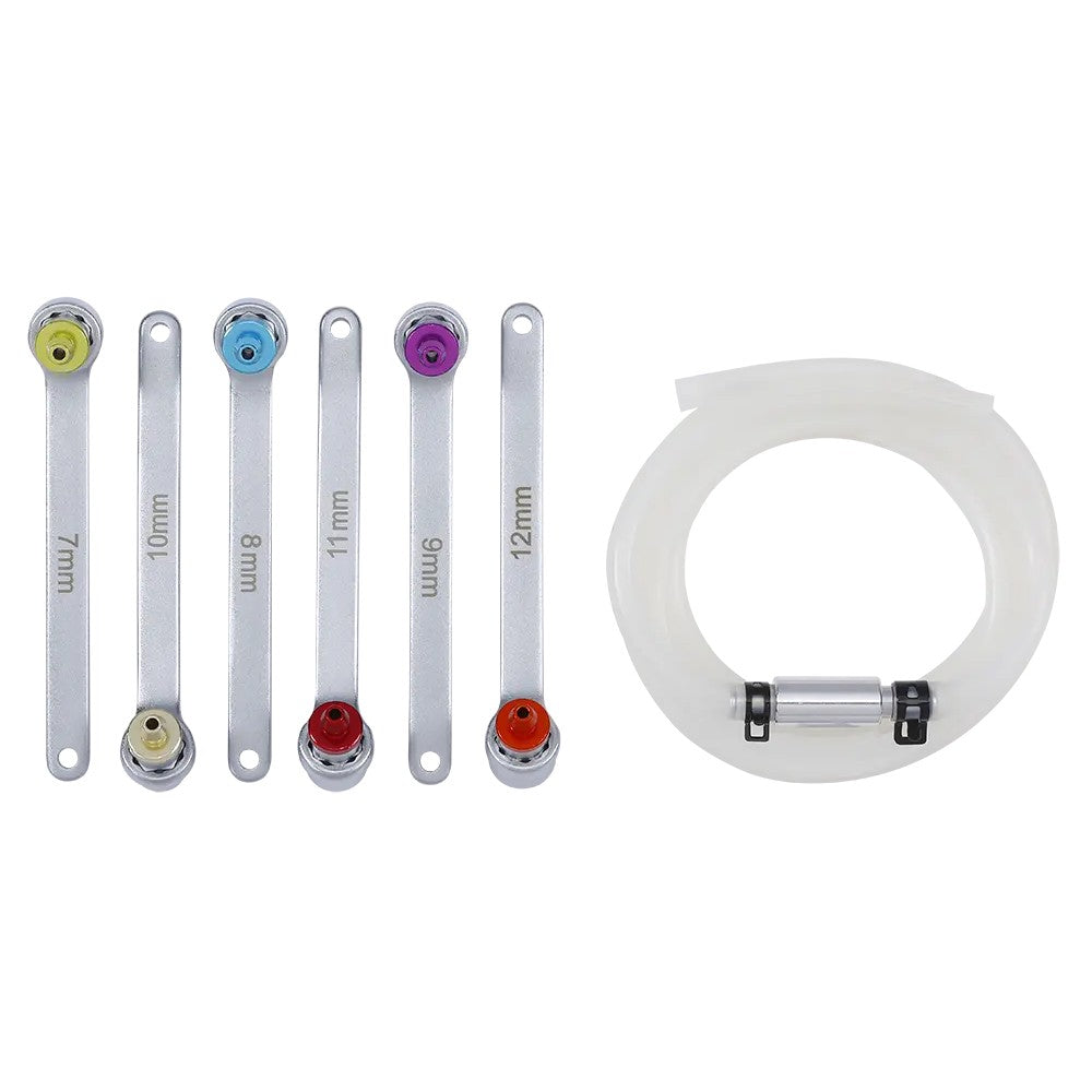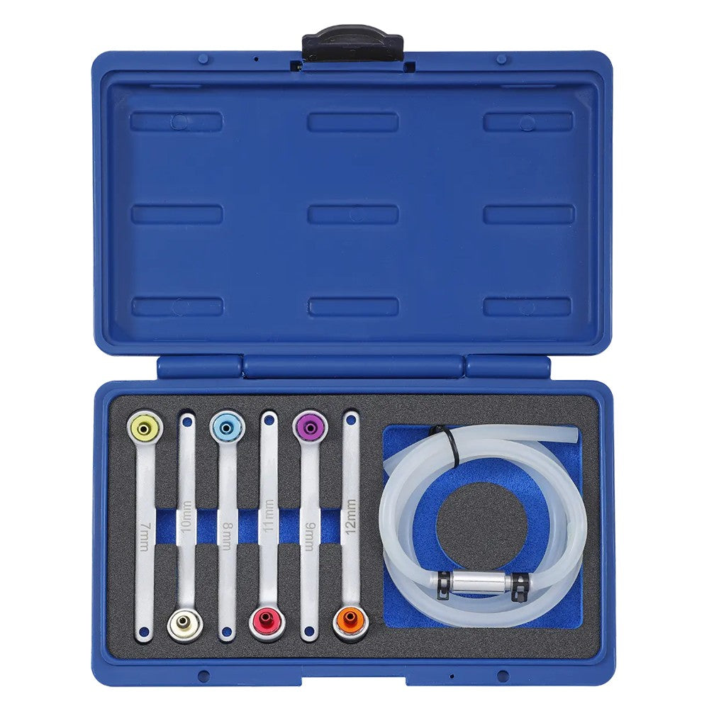 Das Set umfasst sechs Schlüsselgrößen, die gängigsten Anwendungen abdeckend: 7mm, 8mm, 9mm, 10mm, 11mm und 12mm. Alle Schlüssel sind farbcodiert für eine einfache Identifizierung. Ideal für Brems- und Kupplungshydrauliksysteme.