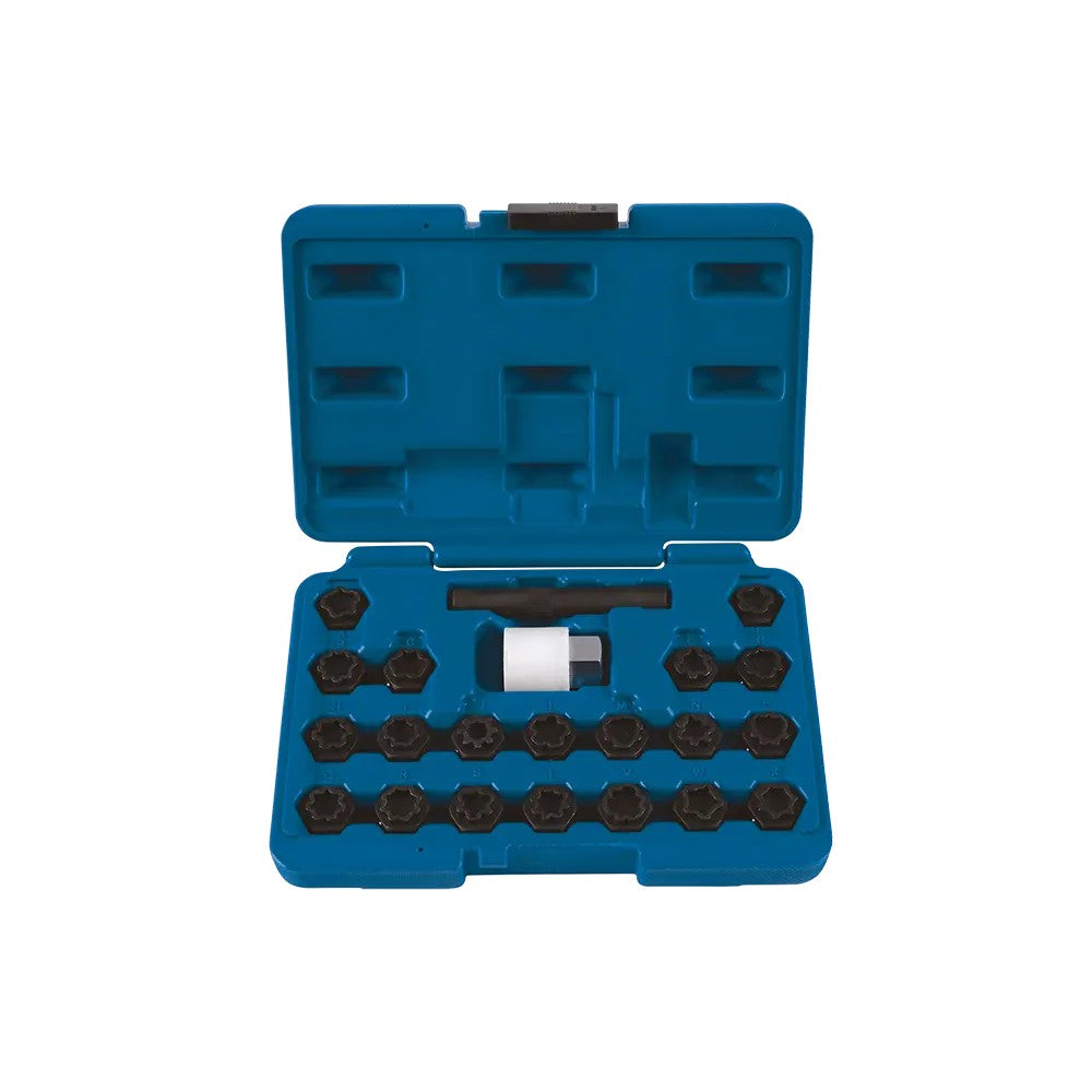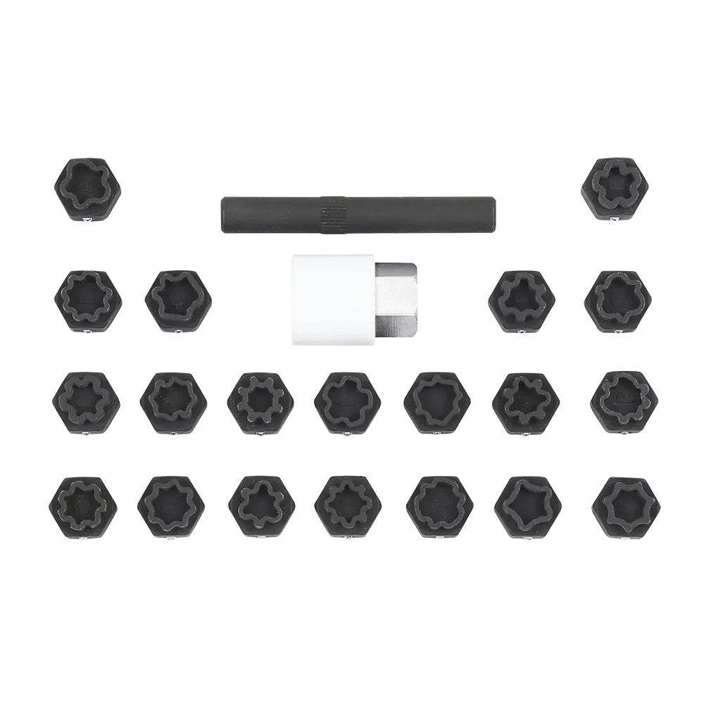 22-teiliges Audi Werkzeugset mit einem 21 mm Adapter und 1/2 Zoll Innenvierkant. Dieses umfassende Set wurde entwickelt, um Verriegelungsbolzen effizient zu entfernen, insbesondere wenn der Adapter beim Fahrzeugservice vergessen wurde. Dies passiert häufig während Wartungs- oder Reparaturarbeiten. Das Set entspricht den OEM Standards T40073 und garantiert somit höchste Qualität und Präzision.
