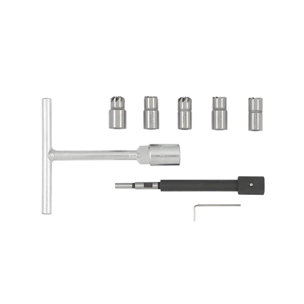 Dieser Satz enthält 5 Diesel Injektorsitzreiniger, einen Führungsdorn und einen T-Griff. Die hochwertigen Werkzeuge sind speziell entwickelt, um Injektorsitze effektiv zu reinigen und von Kohlenablagerungen zu befreien. Ideal für den Austausch von Injektoren, reduzieren sie den Rückstoß bei ungenau sitzenden Injektoren erheblich.