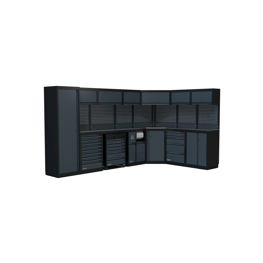 NEXT MSS Schrankwand mit robuster Edelstahl-Arbeitsplatte und einer Höhe von 5026 mm. Ideal für moderne Werkstätten. Diese Schrankwand bietet nicht nur Stauraum, sondern auch eine elegante Arbeitsfläche. Erleben Sie die Kombination aus Stil und Qualität mit der NEXT MSS Schrankwand.