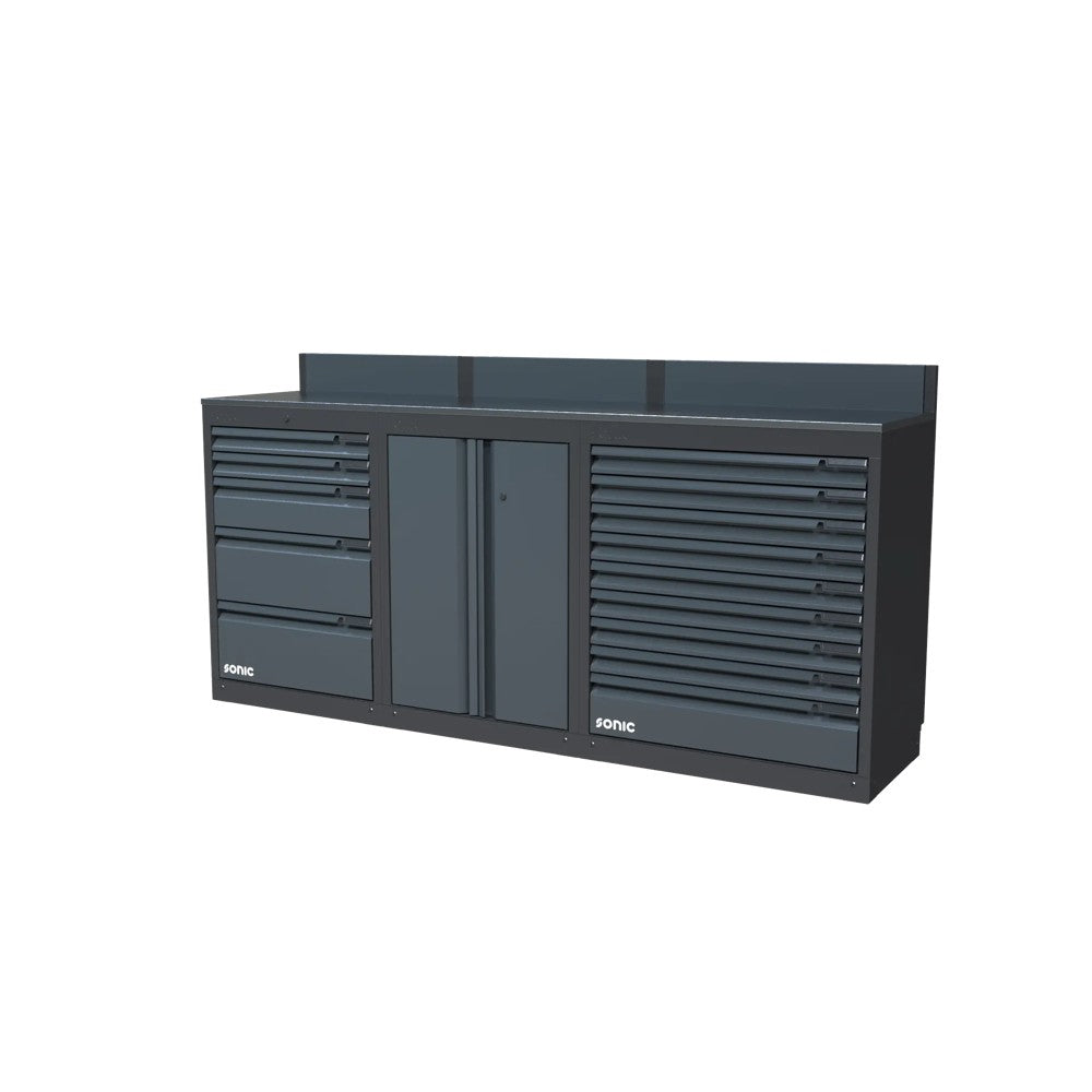 Die NEXT MSS Schrankwand von Sonic besticht durch ihre robuste Edelstahl-Arbeitsplatte und kompakte Bauweise. Mit einer Breite von 2193 mm passt sie perfekt in jeden modernen Werkstattbereich. Die niedrige Ausführung ermöglicht ergonomisches Arbeiten und bietet gleichzeitig großzügigen Stauraum für Werkzeuge und Materialien. Die hochwertige Edelstahloberfläche überzeugt durch ihre Langlebigkeit und einfache Reinigung – ideal für professionelle Anforderungen.
