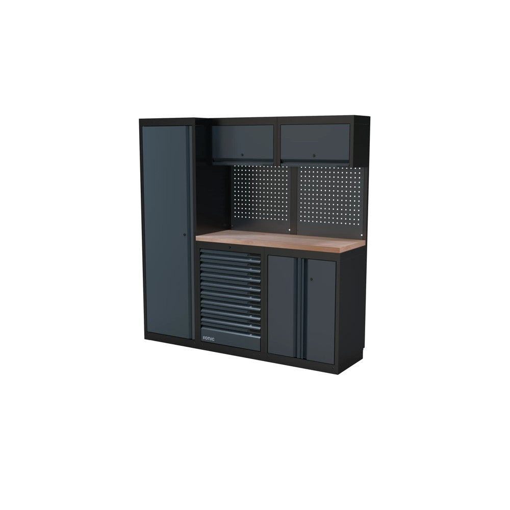 Die Sonic NEXT MSS Schrankwand (Artikelnummer 4930801) mit einer Höhe von 1958 mm kombiniert praktischen Stauraum mit ansprechender Optik. Die robuste Holzarbeitsplatte bietet eine langlebige Arbeitsfläche und verleiht Ihrer Werkstatt ein professionelles Erscheinungsbild. Ideal für die Organisation von Werkzeugen und Materialien – eine zuverlässige Lösung für jeden modernen Arbeitsbereich.
